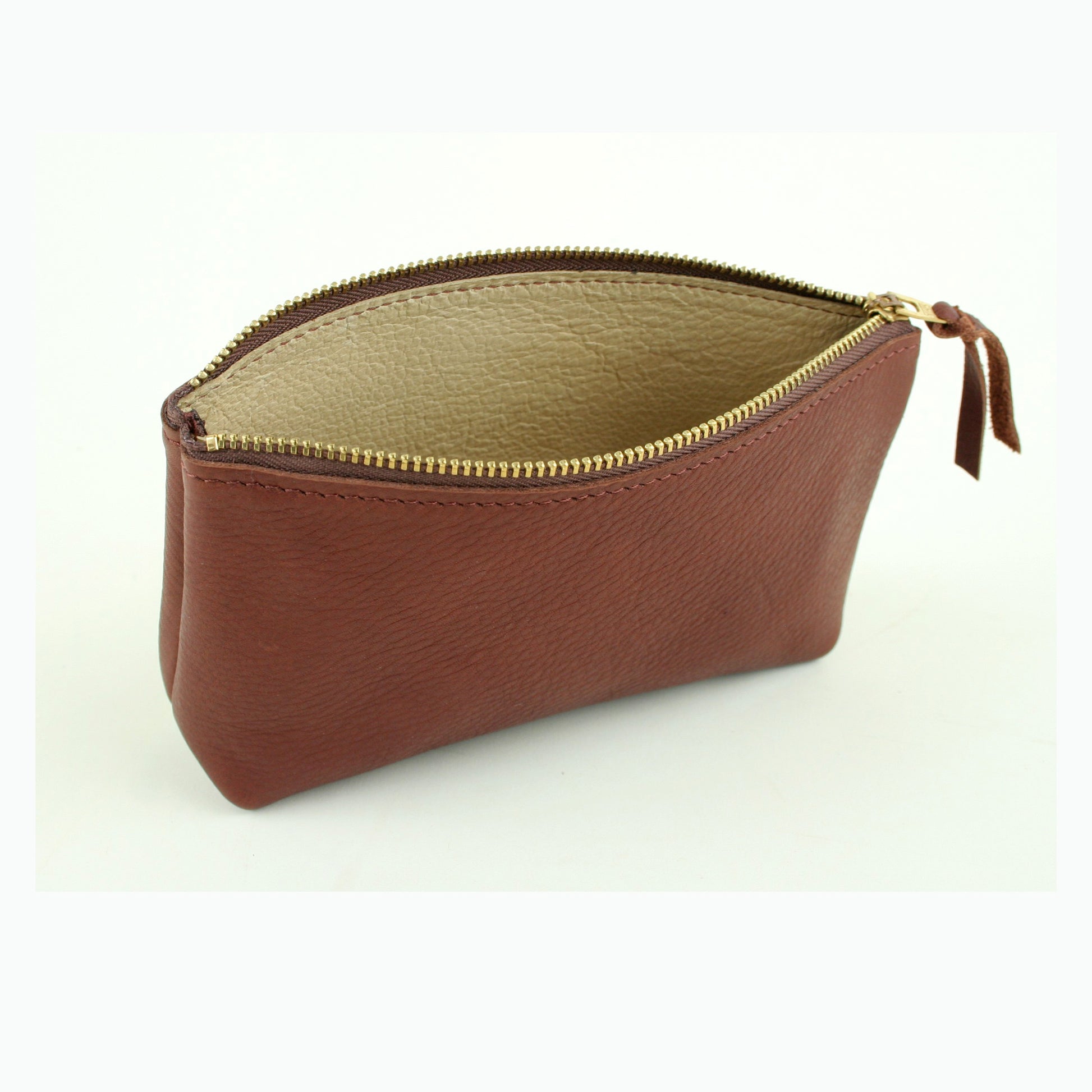 A perfect bag with endless uses. This leather bag is lined with leather and has a long-lasting brass zipper. It has a gusseted bottom to create more space within the bag. Can be used as a cosmetics bag, or to store anything else you might need!